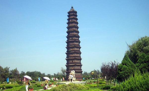 铁塔公园位于中国河南省开封市城区的东北隅,是以现存的铁塔(开宝寺塔)而命名的名胜古迹公园,占地面积51.24公顷,是中国100家名园之一。铁塔位于铁塔公园的东半部,是园内重要的文物,也是主要的景点,始建于公元1049年(北宋皇祐元年),是1961年我国首批公布的国家重点保护文物之一,素有“天下第一塔”的美称。铁塔高55.88米,八角十三层,因此地曾为开宝寺,又称“开宝寺塔”,又因遍体通彻褐色琉璃砖,混似铁铸,从元代起民间称其为“铁塔”,铁塔以其卓绝的建筑艺术和宏伟秀丽的身姿而驰名中外,它设计精巧,完全采用了中国传统的木式结构形式,塔砖饰以飞天、麒麟等数十种图案,砖与砖之间如同斧凿,有沟有槽,垒砌严密合缝。建成九百多年来,历经战火、水患、地震等灾害,但至今仍巍然屹立,令建筑专家和游人叹为观止。 “接引殿”在铁塔的正前面,仿汉白玉砌成,系三门牌楼式仿宋建筑,宽70米,高12米,大门左右墙壁上,对称镶嵌着8块庄严、肃穆、圣洁青石神佛坐像,1986年为供奉北宋文物“接引佛”而建。该殿为重檐歇山式建筑,殿前,石狮雄踞,鼎香缭绕;殿周,24根大柱抱殿而矗;大殿台基,青石栏杆拦护,妙趣横生的96只小狮子环绕排开。“接引殿”的旁边是“灵感院”。灵感院是为供奉白玉佛像而建。正殿内供奉的释迦牟尼“白玉佛像”,是1933年由旅居缅甸的华侨捐赠。佛像高约1米,由整块白玉精雕而成,秀丽端庄,晶莹洁亮,堪称佳品。 铁塔位于开封市东北角归远门里原甘露寺东侧。这座铁塔的建造同一颗舍利有关。相传释迦佛舍利被古印度的8个国王均分,其中摩陀国中的一份在200年后被信仰佛教的阿育王所有,据说他取出佛舍利分藏在8.4万个小塔内,运送到各地,其中一部分传入中国。浙江宁波的阿育王寺就是因为得到一份阿育王的佛舍利而建造的。到了五代时期,占据浙江一带的吴越王将阿育王寺的佛舍利迎入杭州供奉,后来宋朝军队逼近吴越,当时吴越王降宋,宋太祖赵匡胤就把佛舍利供奉在东京的滋福殿中,后来又命人在城内开宝寺的福圣院中修建了当时被称为“京城之冠”的13层木塔,用作供奉,这座就是我国历史上有名的开宝寺塔。 开宝塔在建成55年后毁于雷火。1049年当时宋仁宗重修开宝塔,这次重修,换了地方,由福盛院改到了上方寺。为了防火,拆了木料改成了砖和琉璃面砖,这就是今天我们见到的铁塔—汴京八景之一。塔身内砌旋梯登道,可拾阶盘旋而上,直登塔顶。当登到第5层时,可以看到开封市内街景,登到第7层时看到郊外农田和护城大堤,登到第9层便可看到黄河如带,登到第12层直接云霄,顿觉祥云缠身,和风扑面,犹若步入太空幻境,故有“铁塔行云”之称。 铁塔又名“开宝寺塔”,坐落在开封城东北隅铁塔公园内,因塔身全部以褐色琉璃瓦镶嵌,远看酷似铁色,故称为“铁塔”。 铁塔建于北宋皇祐元年(1049年),距今已有900多年历史,1961年被国务院定为全国重点文物保护单位。 铁塔成等边八角形,共十三层,高55.88米,底层每面阔为4.16米,向上逐层递减。塔身遍砌花纹砖,上有飞天、麒麟、菩萨、乐伎、狮子等花纹图案50余种,造型优美,神态生动,堪称宋代砖雕艺术杰作。铁塔以卓绝的建筑艺术闻名中外,其设计精巧,结构坚固,虽经地震、河患、狂风暴雨和人为的破坏,仍巍然屹立。